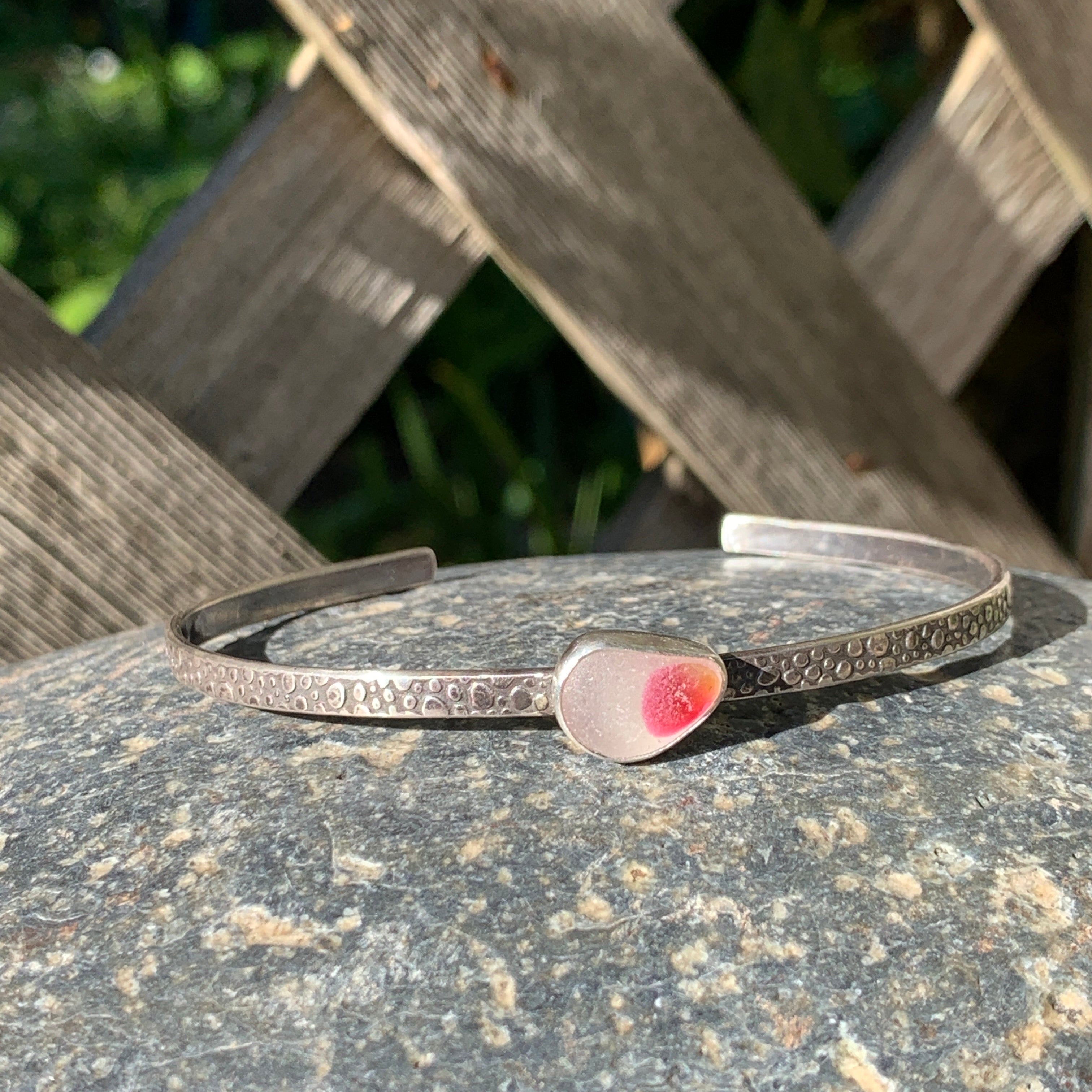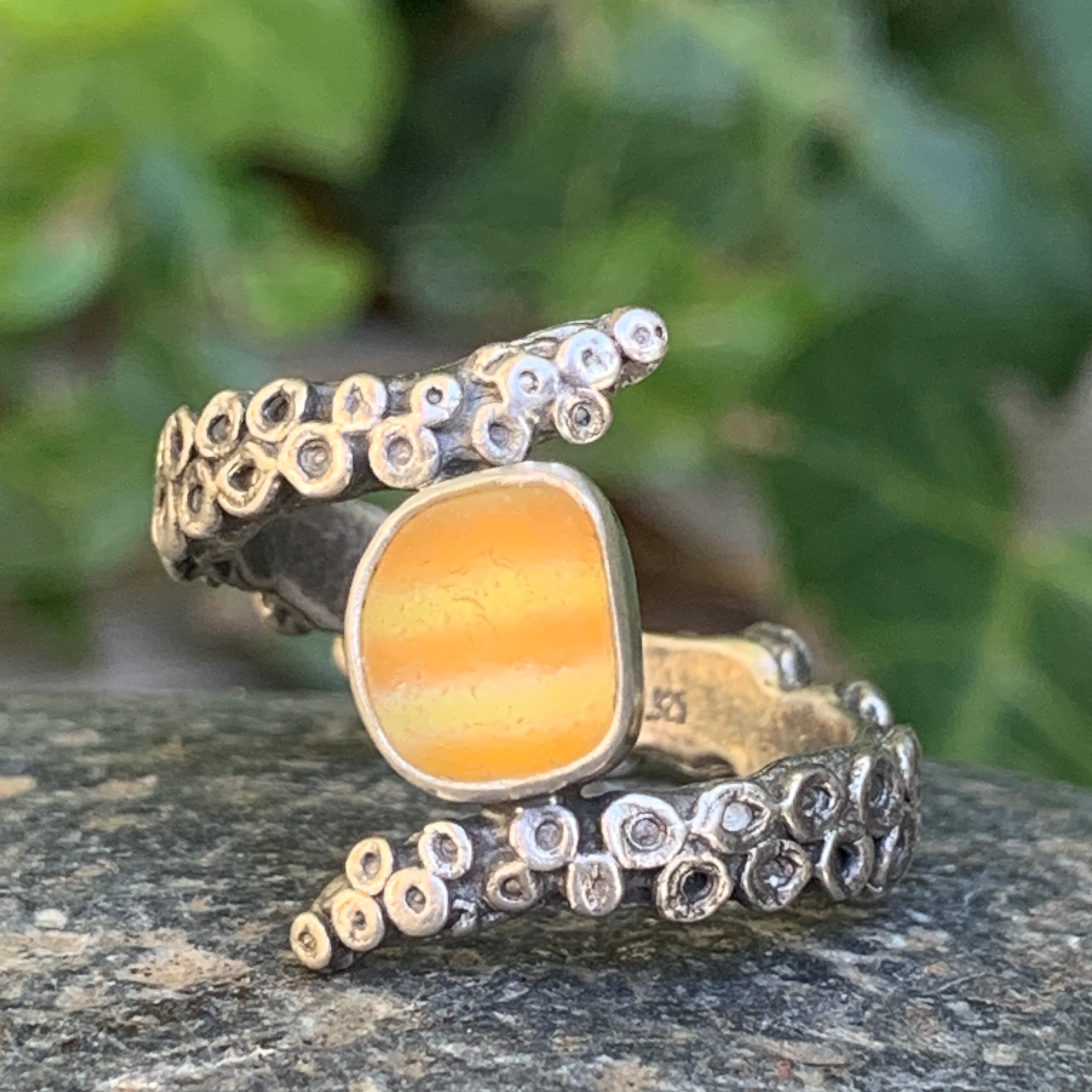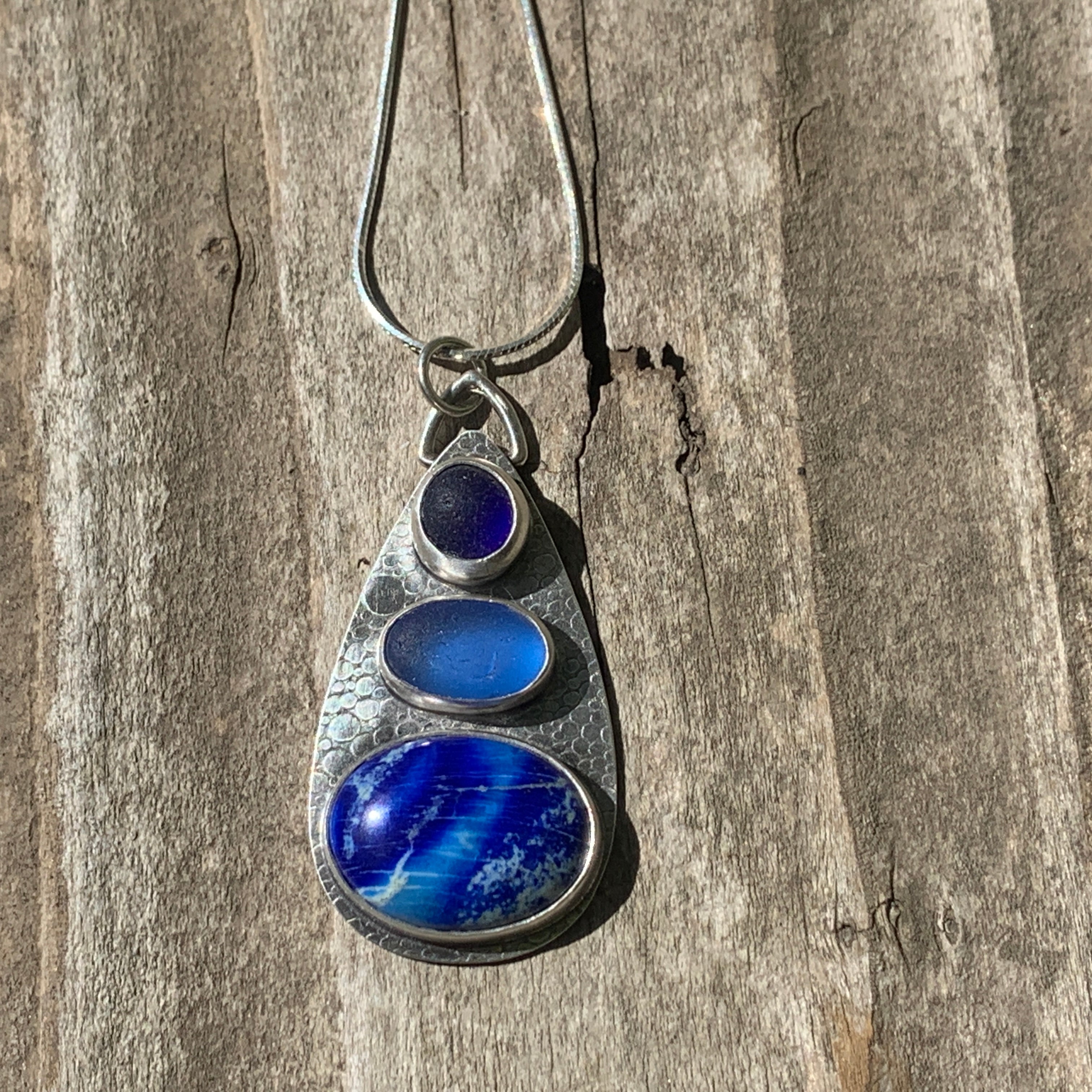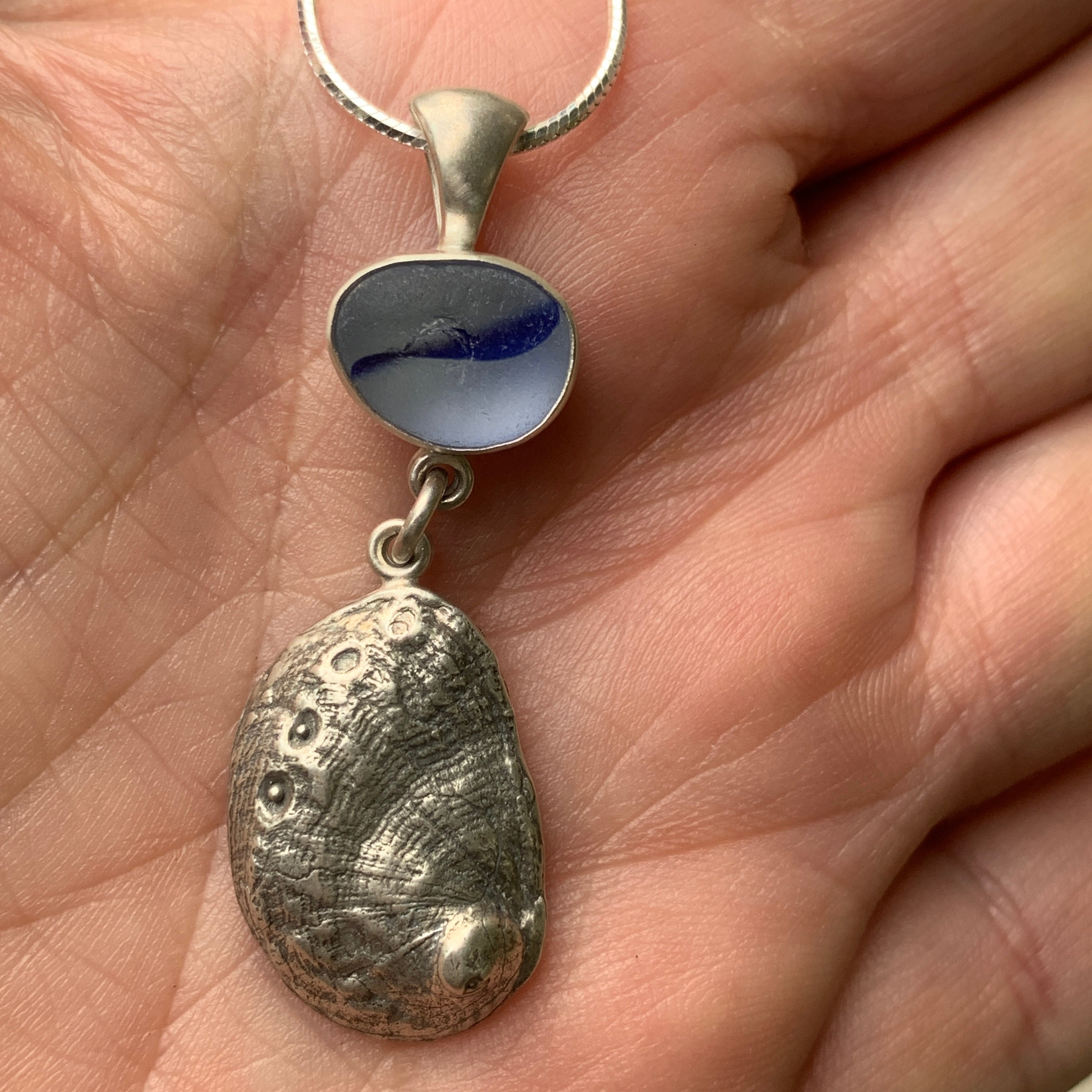 This pendant features a hand cast abalone with clear and blue sea glass. The sea glass was found in Seaham England. The abalone was cast using the lost wax casting process. The pendant is made from fine and sterling silver. It measures approximately 1 3/4“ x 3/4“. The pendant comes with an 18 inch sterling silver snake chain.