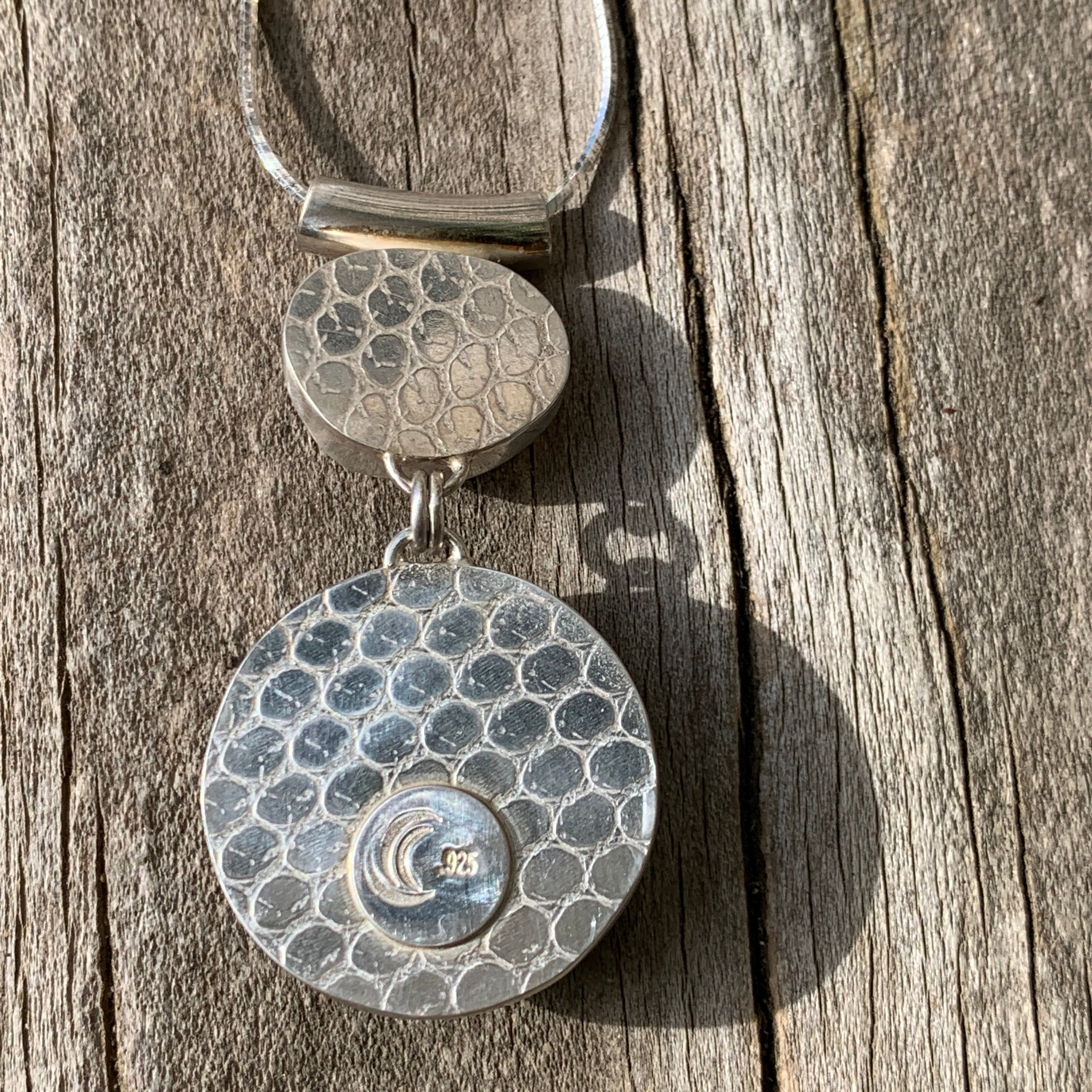 This pendant features a lampwork urchin cabochon and yellow sea glass from Seaham England. The pendant measures approximately 1 3/4”x 1 ”. The pendant is made with fine and sterling silver and comes with an 18 inch sterling silver snake chain.