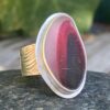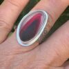 This burgundy and clear multi was found in Seaham England. The sea glass is set in fine and sterling silver. The face of the glass measures approximately 1”x1/2”. The wide textured band is size 9.