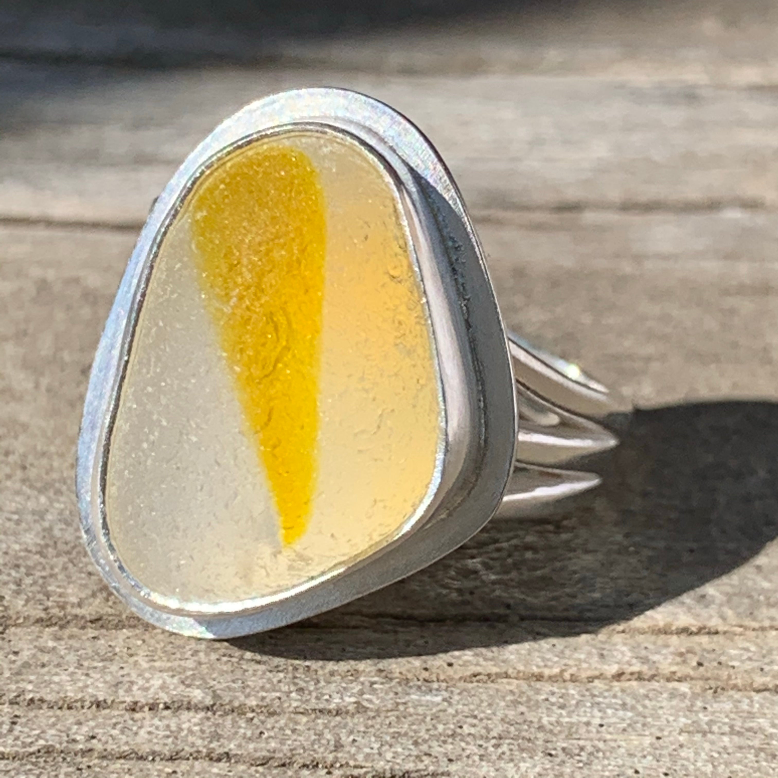 This yellow and clear Sea Glass was found in Davenport California. The glass is set with fine and sterling silver. The face of the range measures approximately 5/8” x 1/2”. The triple ring shank is size 7 and can be increased 1/4 th size.