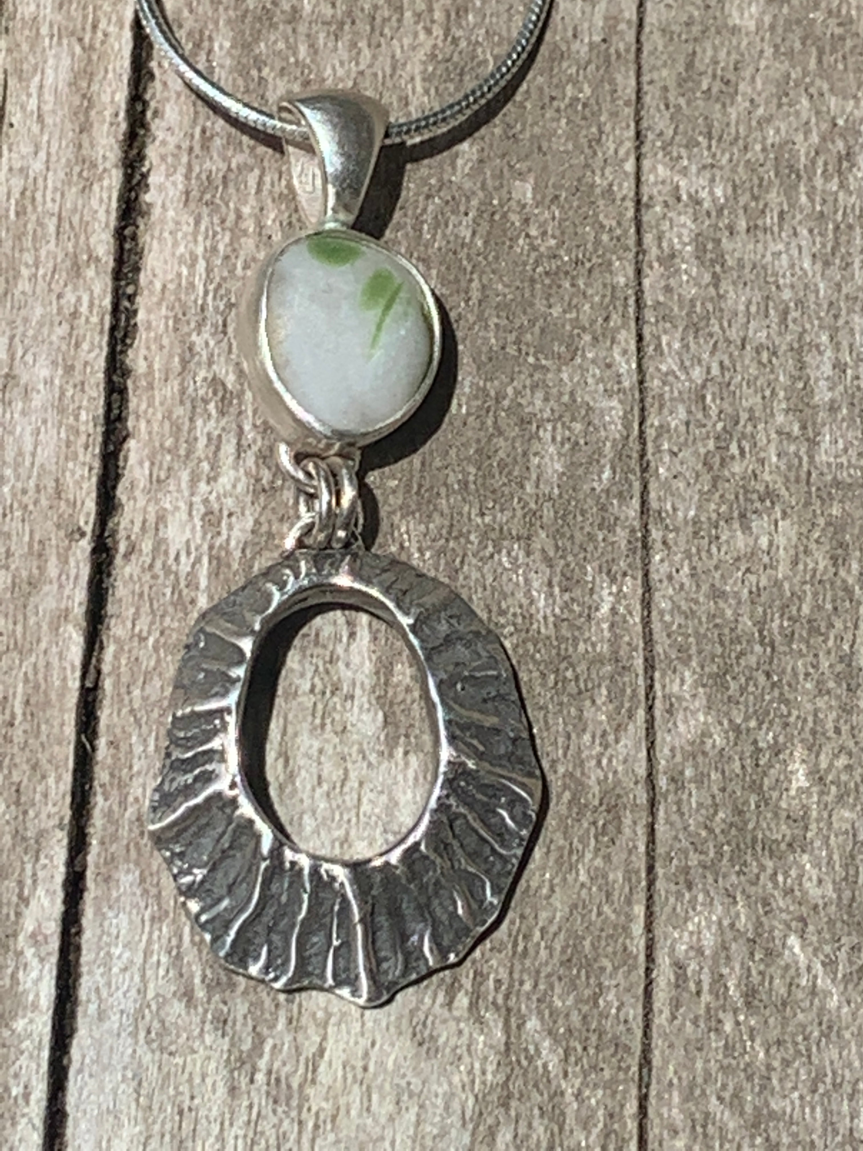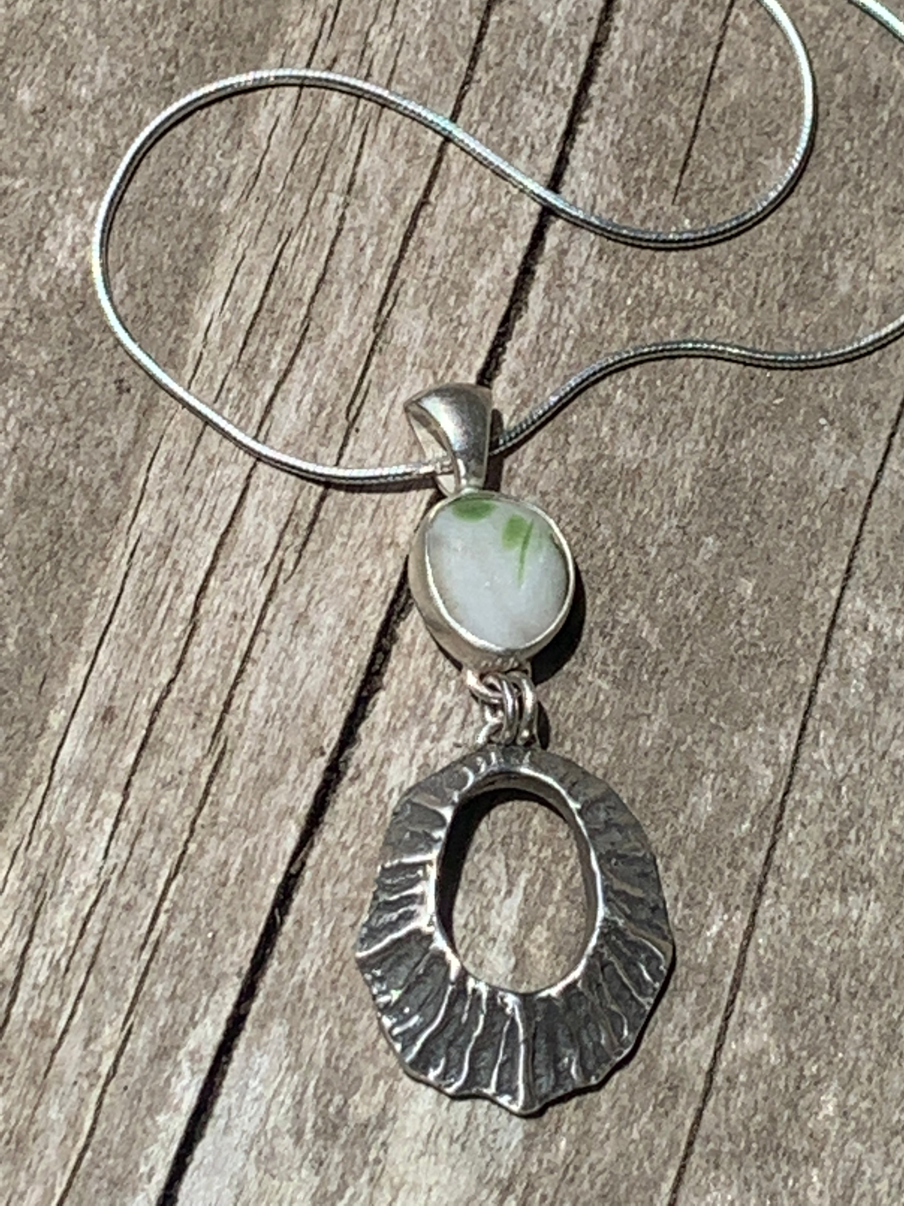This Davenport limpet pendant features a white and green Davenport multi. The limpet was hand cast by me using the lost wax casting method. Pendant measures approximately 1 3/4” x 3/4”. The pendant was made with fine and sterling silver and comes with an 18” sterling silver snake chain.