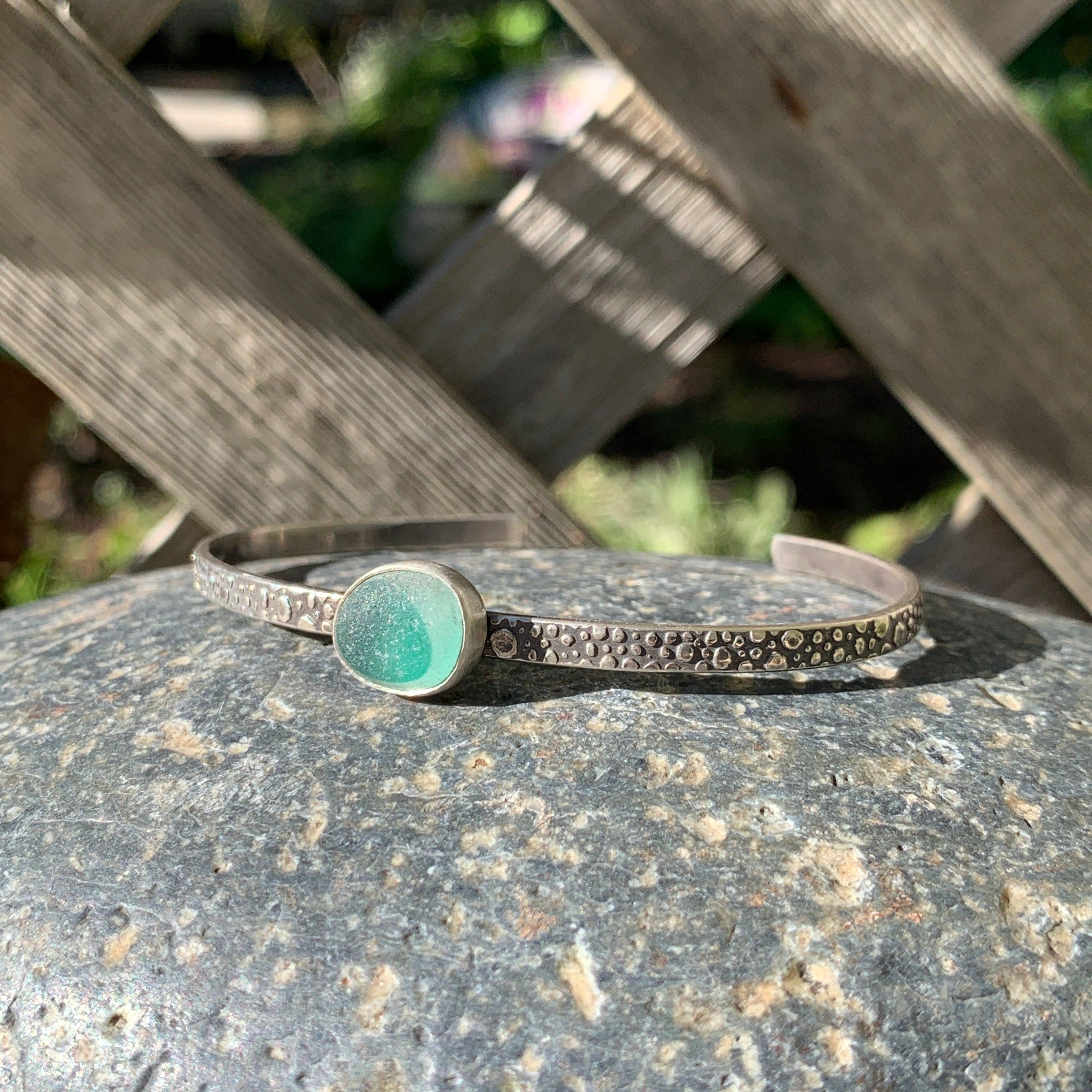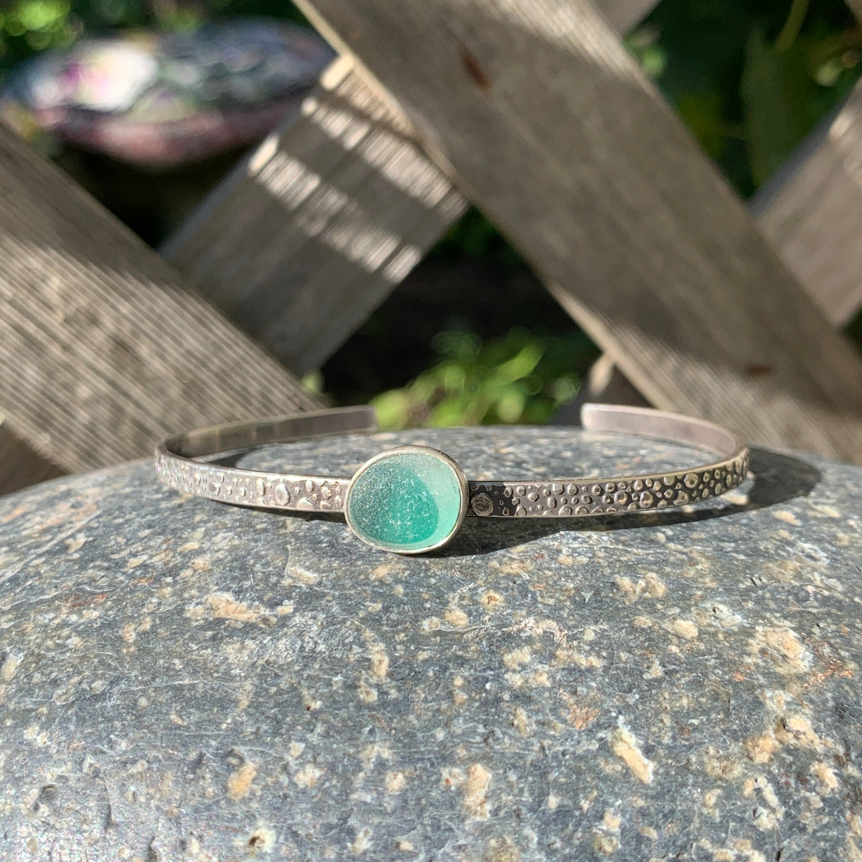 This mini cuff features a green multi from Seaham England. The cuff is made with fine and sterling silver. The glass measures approximately 1/2” by 3/8”. The cuff will fit an average sized wrist.
