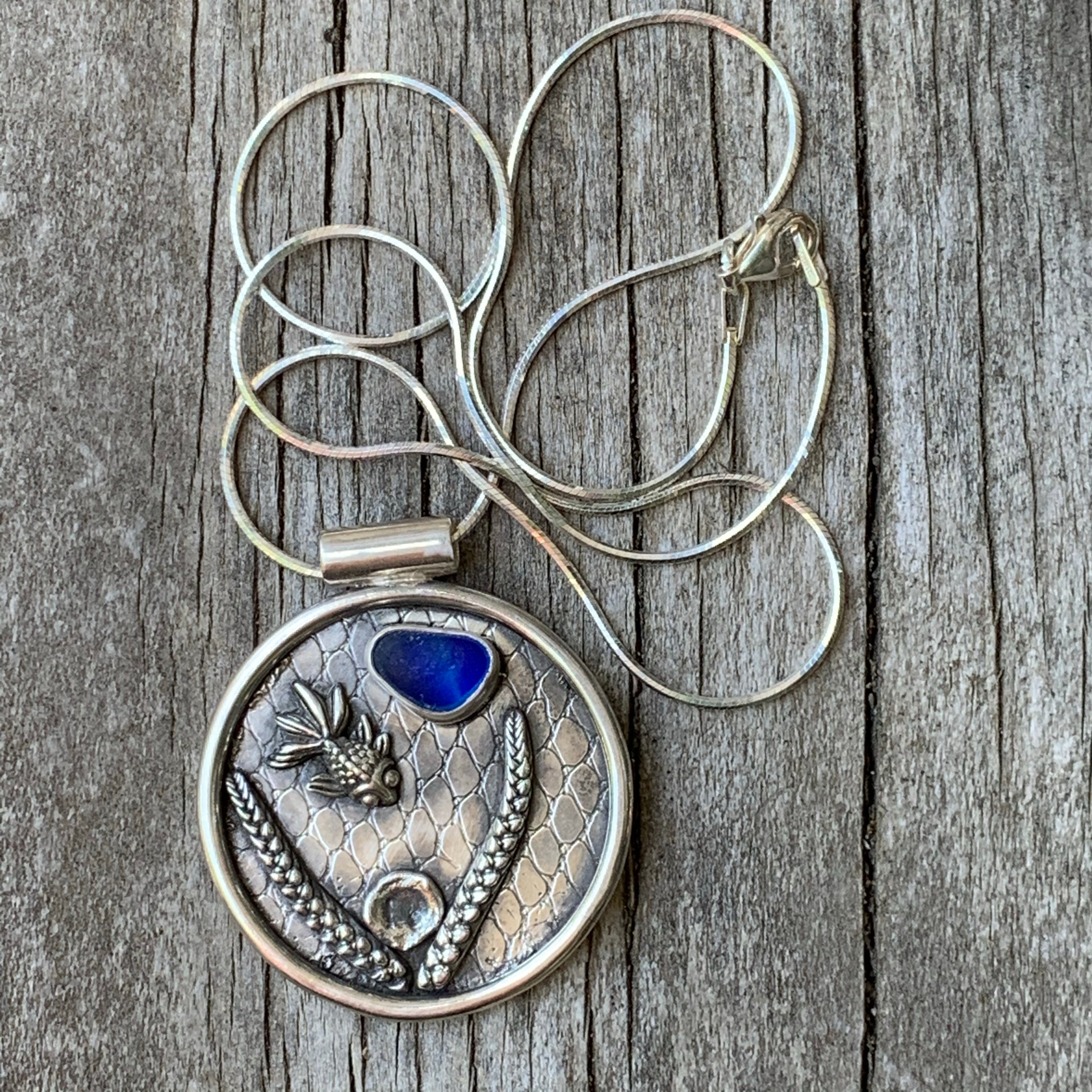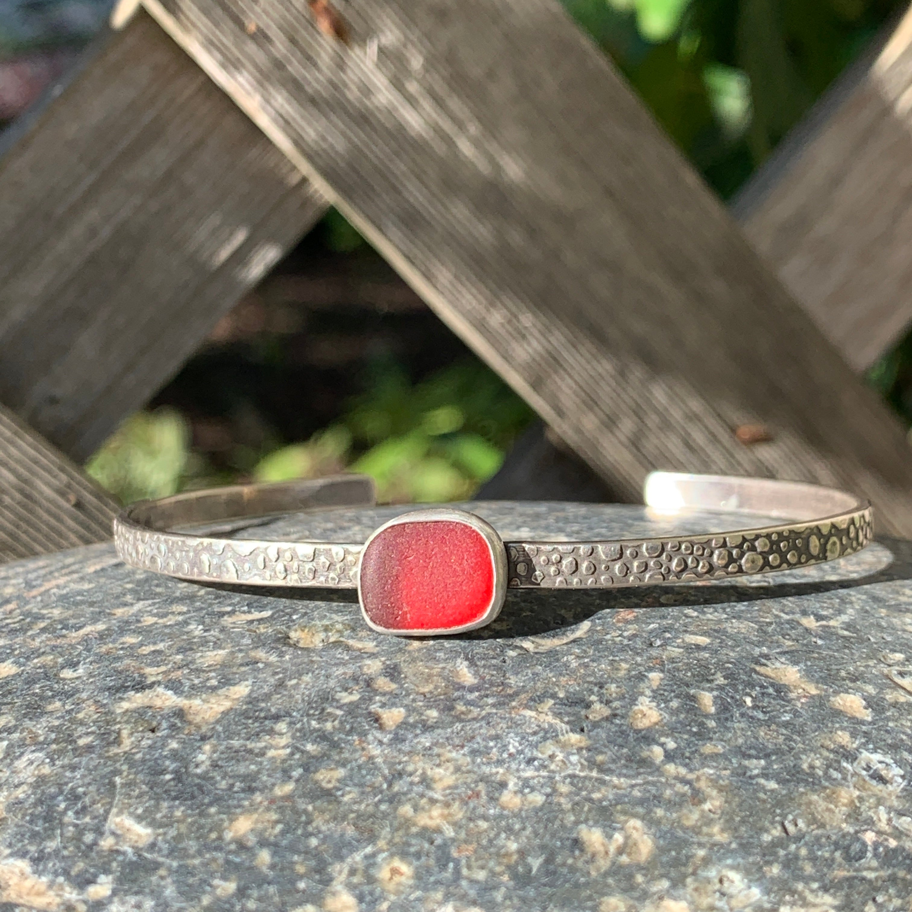 This Mulberry and clear Sea Glass was found in Seaham England. The glass is set in fine and sterling silver. The face of the ring measures approximately 3/4“ x 3/8” . The double ring shank is size 6 and can be increased 1/4 th size.