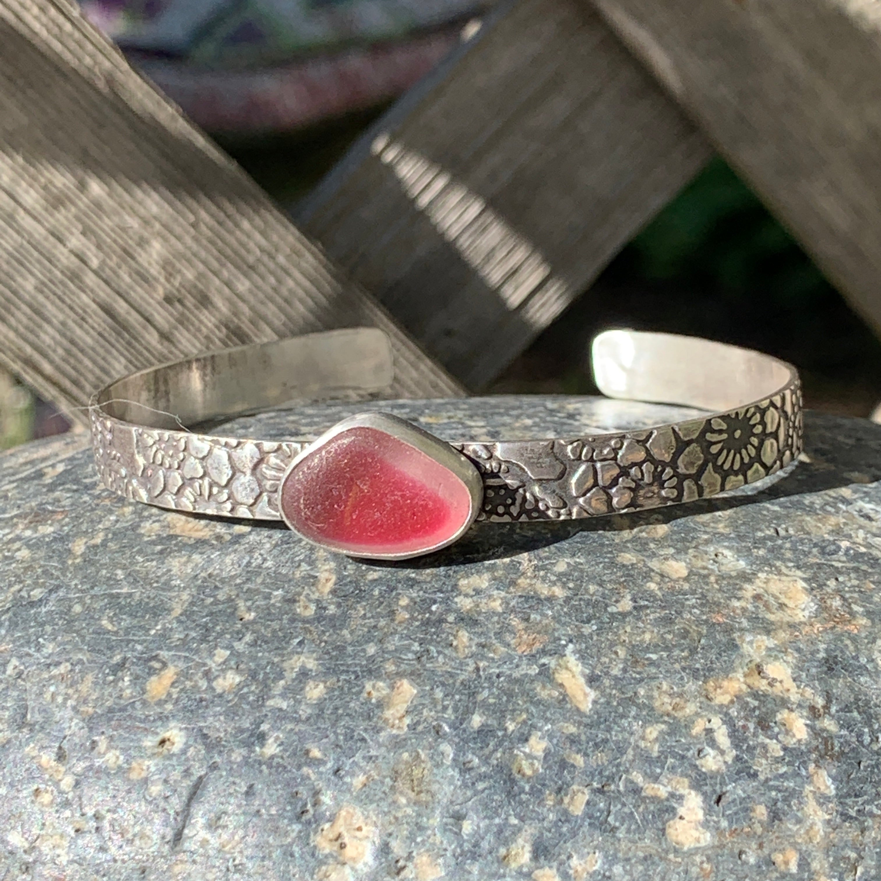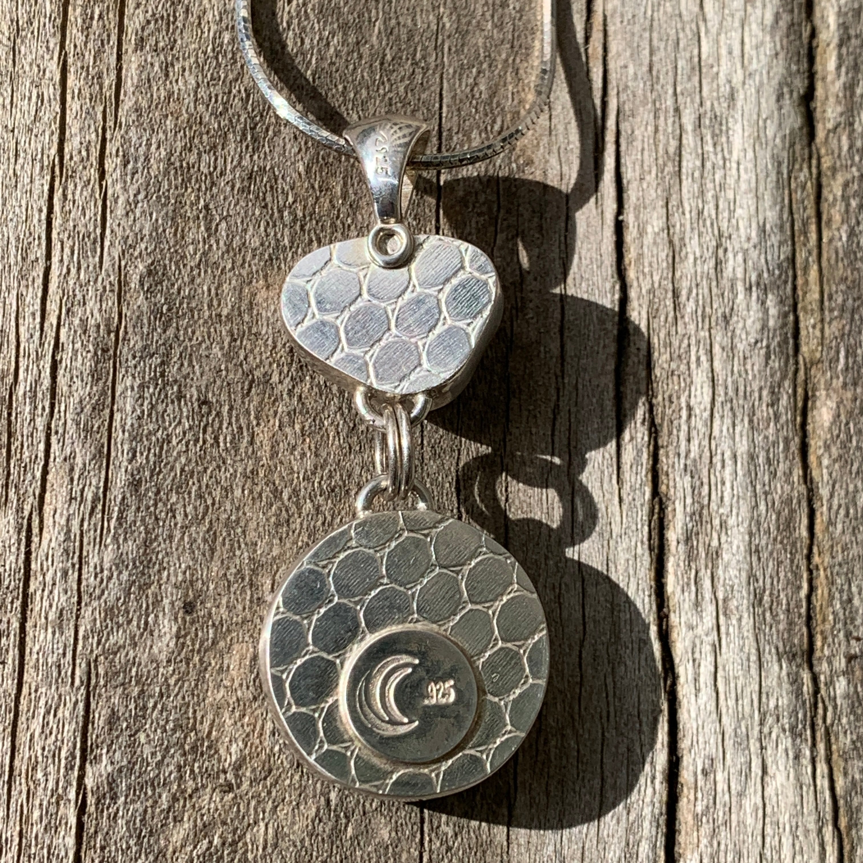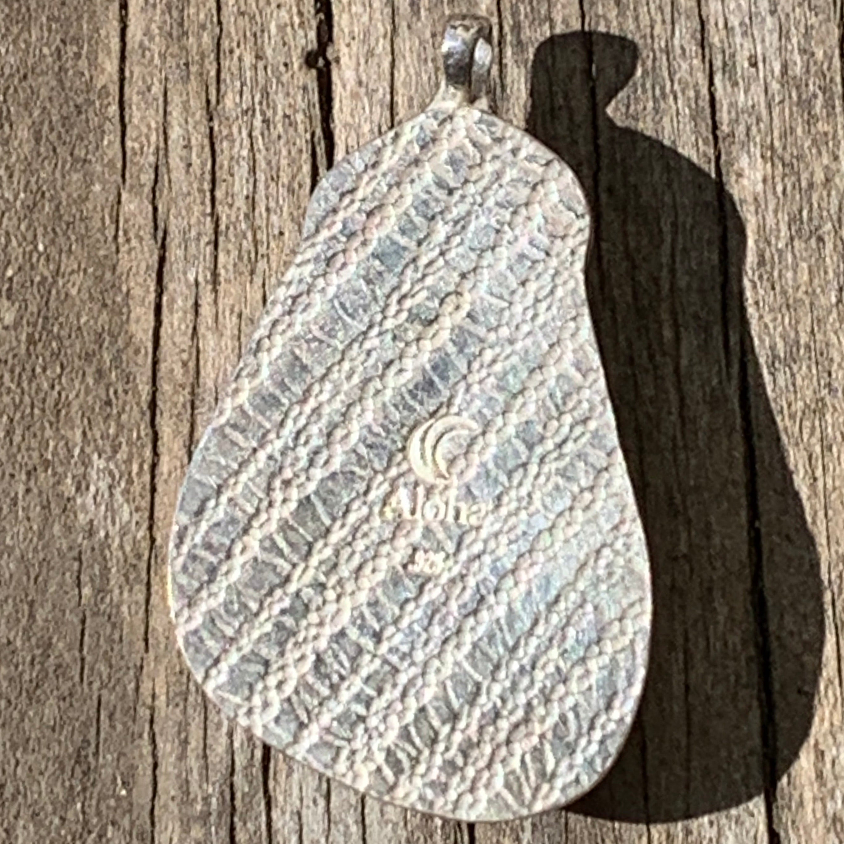 This extra large orange Davenport sea glass has gray layer underneath the orange. It was found at Davenport Beach in California. The glass is set in fine and sterling silver. It has a whale tail nail. The pendant measures appointment 1 1/2 “ by 1”. It comes with a sterling 18 inch snake chain with a lobster clasp.