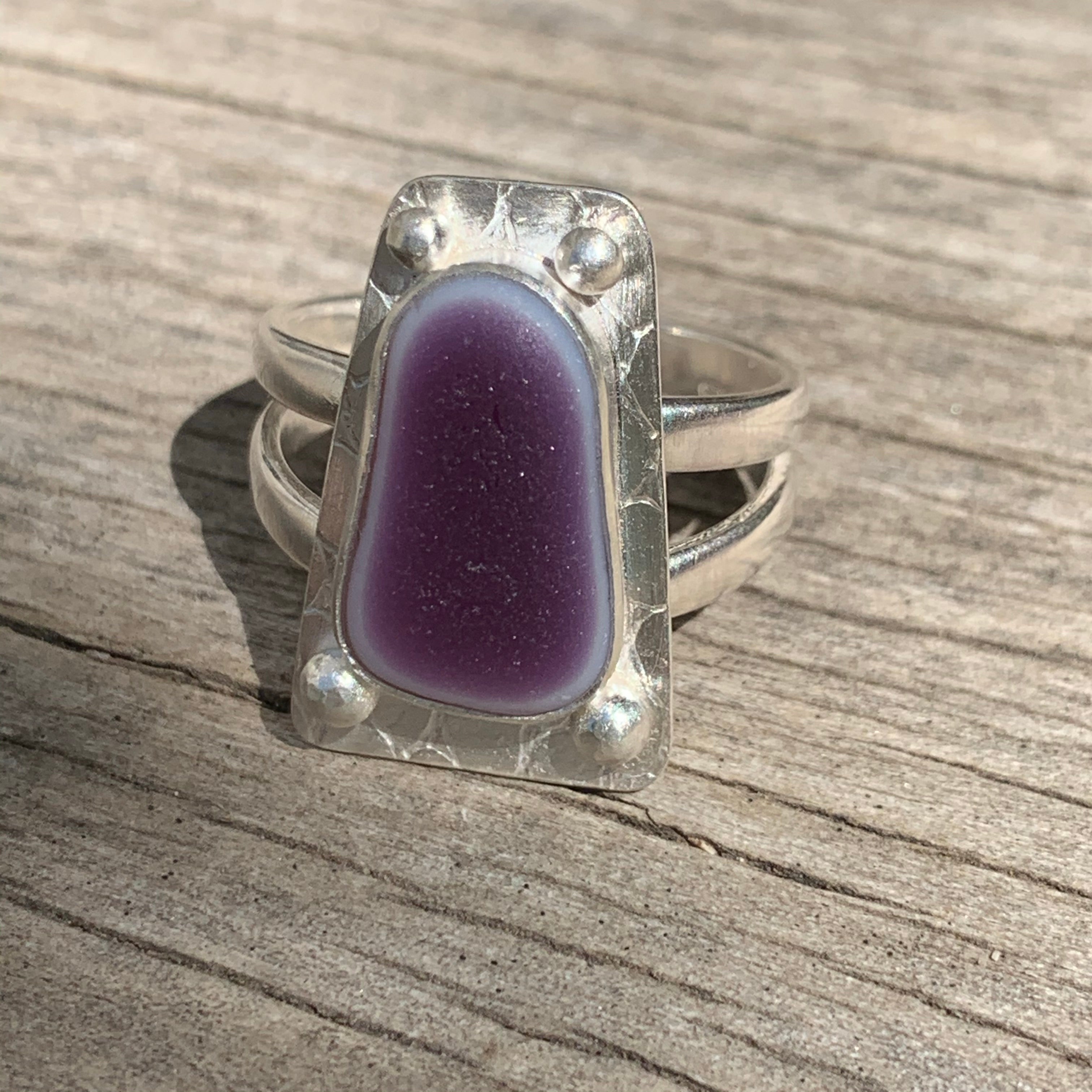 This purple and white sea glass was found in Davenport California. It is set in sterling and find silver. The ring measures approximately seven eights inch x 1/2 inch. The double ring shank is size 7.75 and can be increased 1/4 th size.