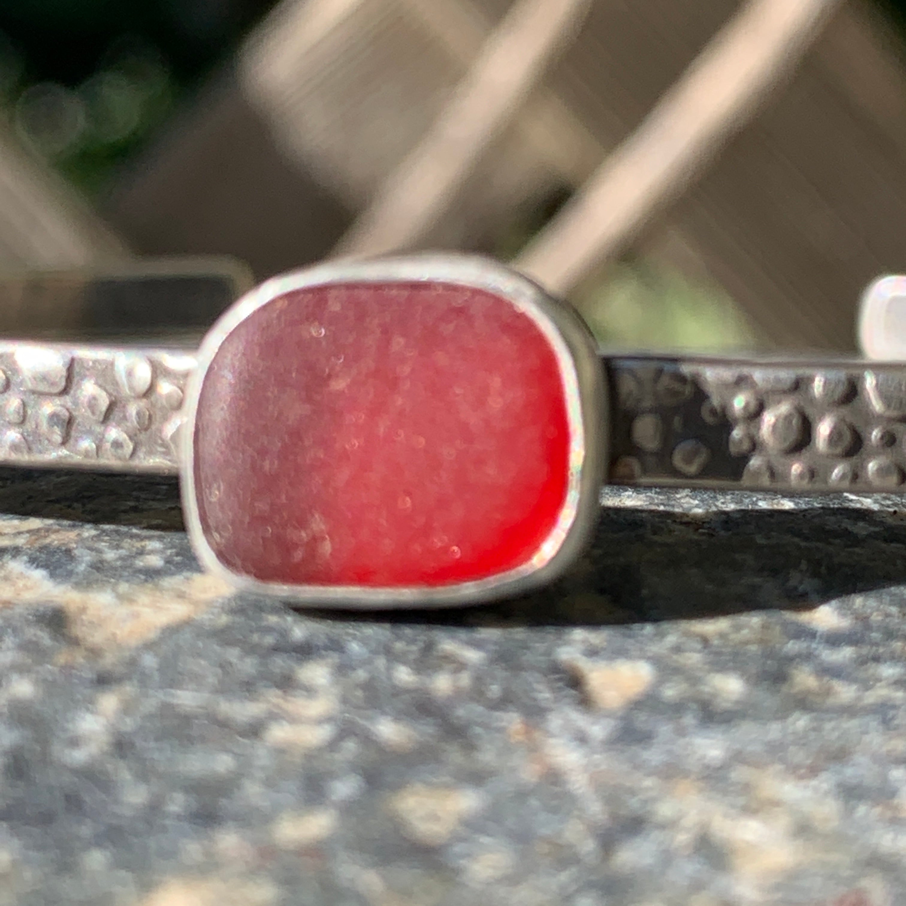 This mini cuff features cherry red sea glass from Seaham England. The cuff is made with fine and sterling silver. The glass measures approximately 3/8” by 5/16”. This cuff will fit an average size wrist.