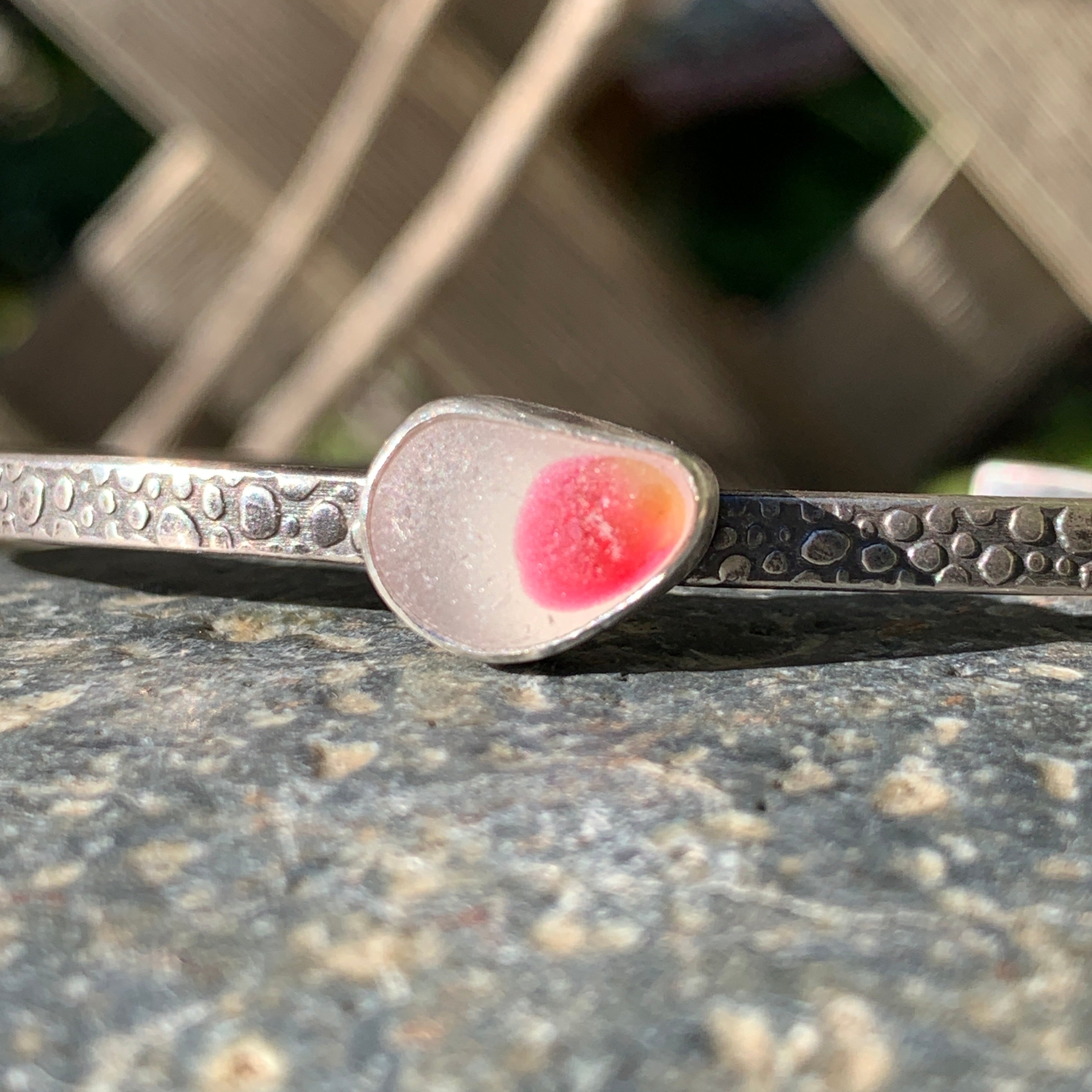 This mini cuff features rose and clear sea glass From Seaham England. The cuff is made with fine and sterling silver. The glass measures approximately 1/2” x 1/4”. The cuff will fit an average size wrist.