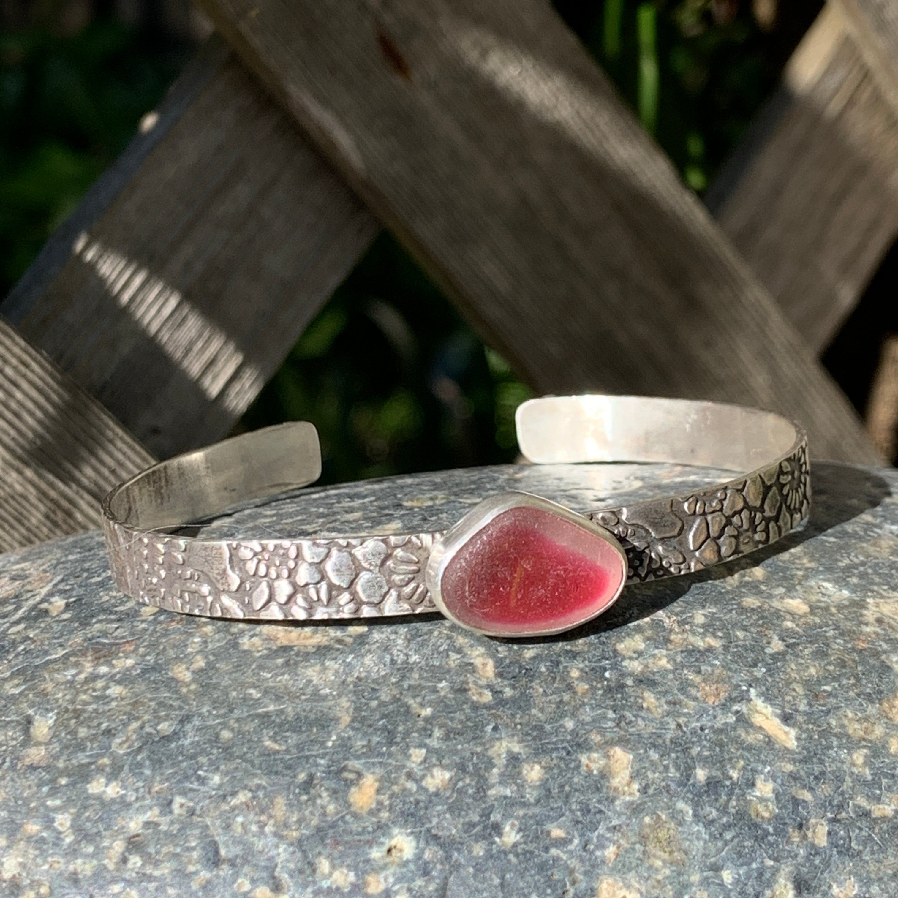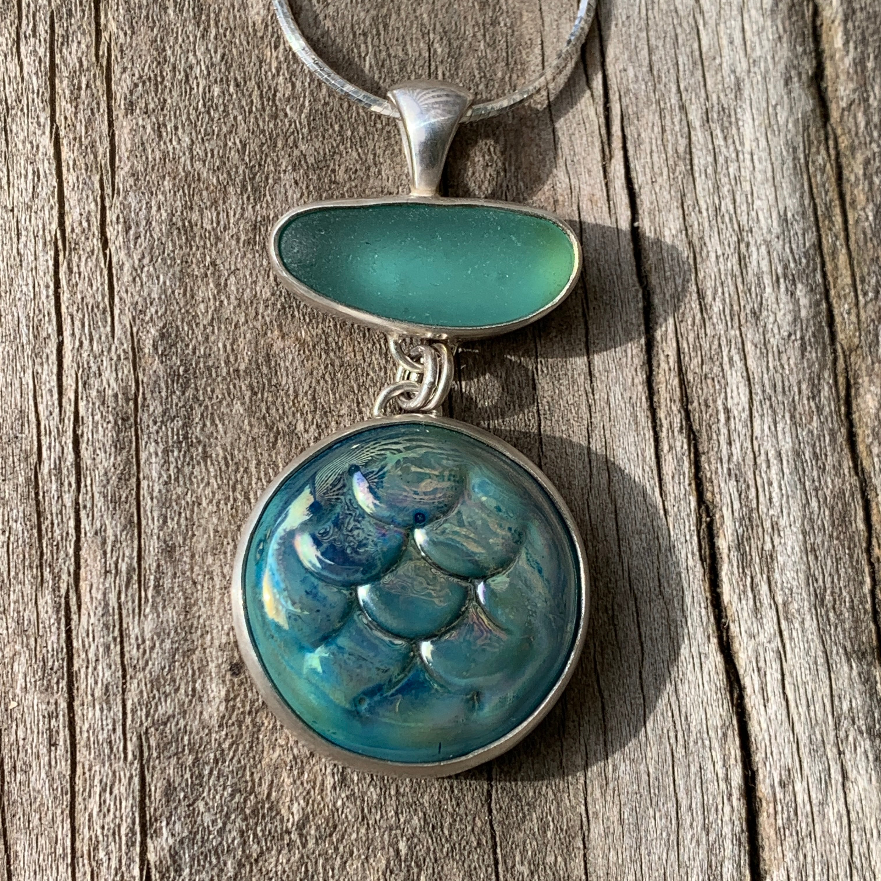 This pendant features a lampwork mermaid scale glass cabochon and teal sea glass. The pendant measures approximately 1 3/4”x 7/8”. The pendant is made with fine and sterling silver and comes with an 18 inch sterling silver snake chain.