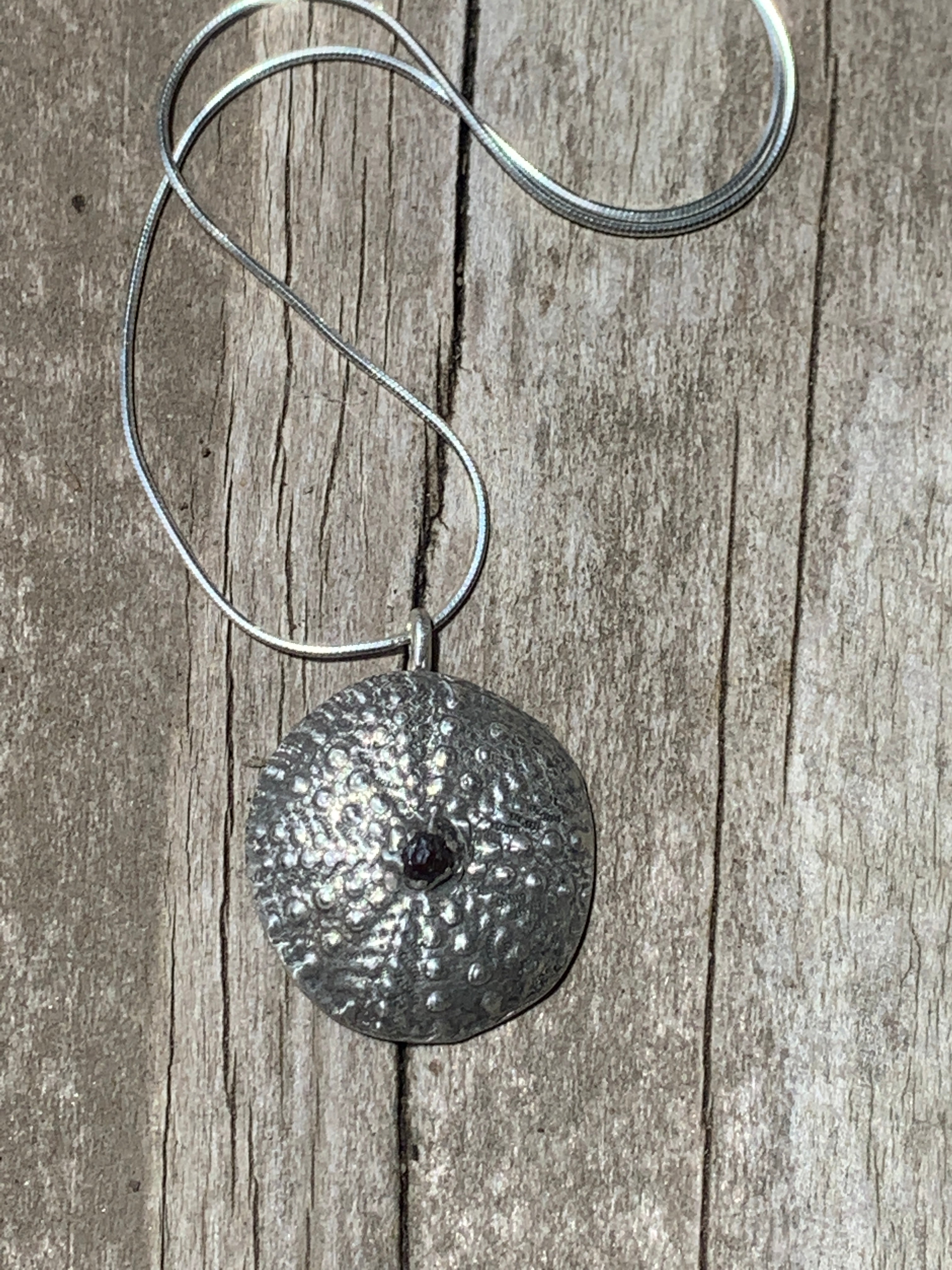 This Thames Garnet Pendant was hand cast by me using the lost wax casting method. There is a small raw Garnet that was found on the Thames River in London cast in the center of the pendant. The pendant measures approximately 1” x 1 1/8”. The pependent is sterling silver and comes with an 18 inch sterling silver snake chain..