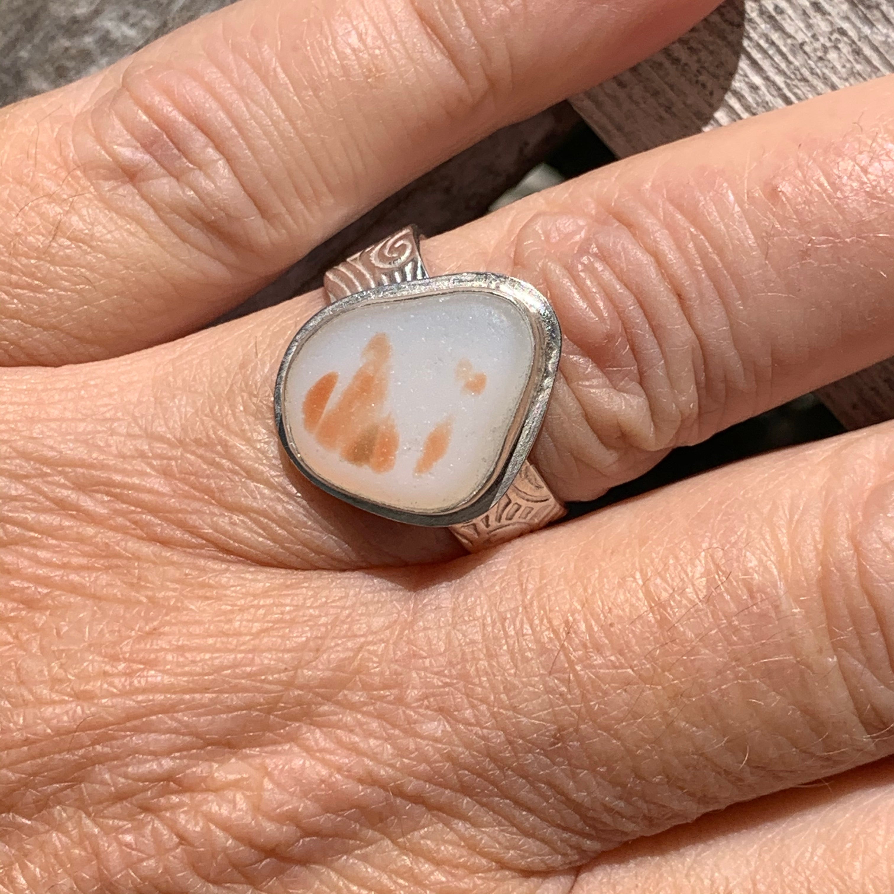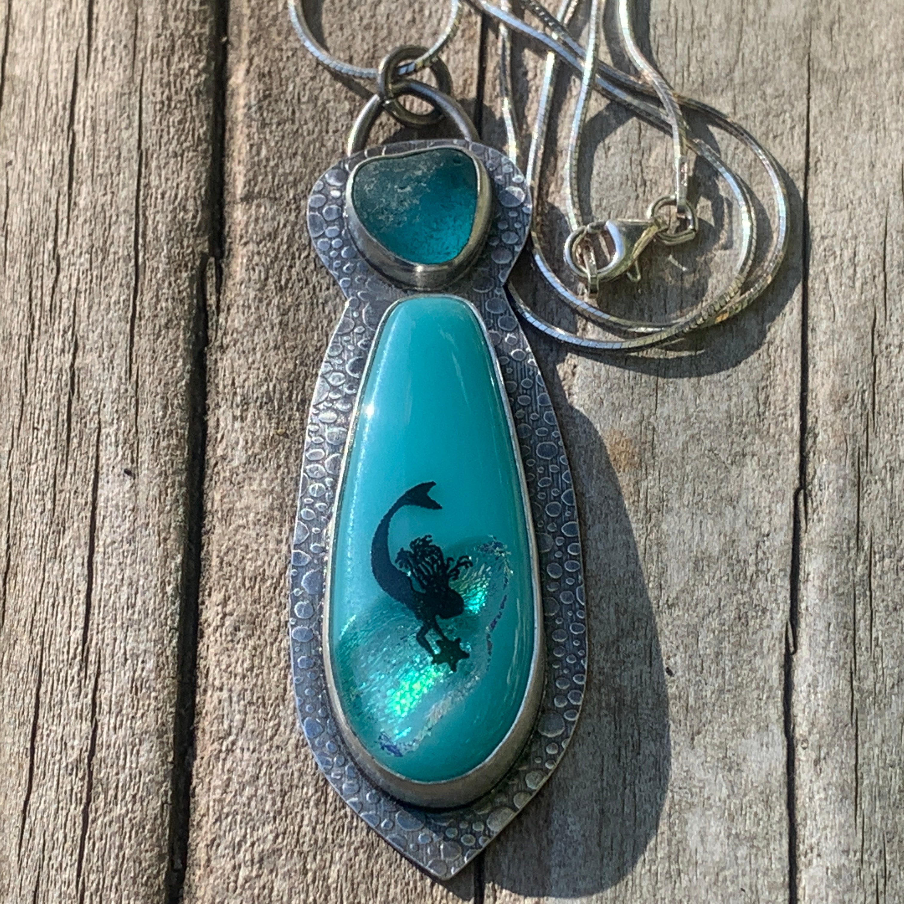 This pendant features a fused glass cabochon and handmade silver seashell embellishments. The pendant measures approximately 1 3/4” x 1 1/2”. The pendant is made with fine and sterling silver and comes with an 18 inch Sterling snake chain.